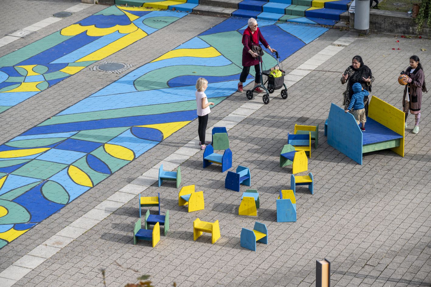 Der Bad Homburger Stadtteil Gonzenheim ist gut verkehrlich angebunden, verfügt über die letzten städtischen langfristigen Flächenpotenziale für den Wohnungsbau – und erlebt hautnah den knapper werdenden Wohnraum. Nun soll der Gunzoplatz verstärkt zu einem sozialen Treffpunkt werden: Im September 2023 wurden die Anwohnerinnen und Anwohner zu einer Pop-Up-Kunstaktion eingeladen. Angeleitet durch die Künstler Thekra Jaziri und Marco Poblete gestalteten Kinder von der Gonzenheimer Kita und dem Hort der Friedrich-Ebert-Schule den Gunzoplatz neu. Es entstanden ein farbenfroher „Teppich“ sowie einfache Sitzmöglichkeiten aus Holz.