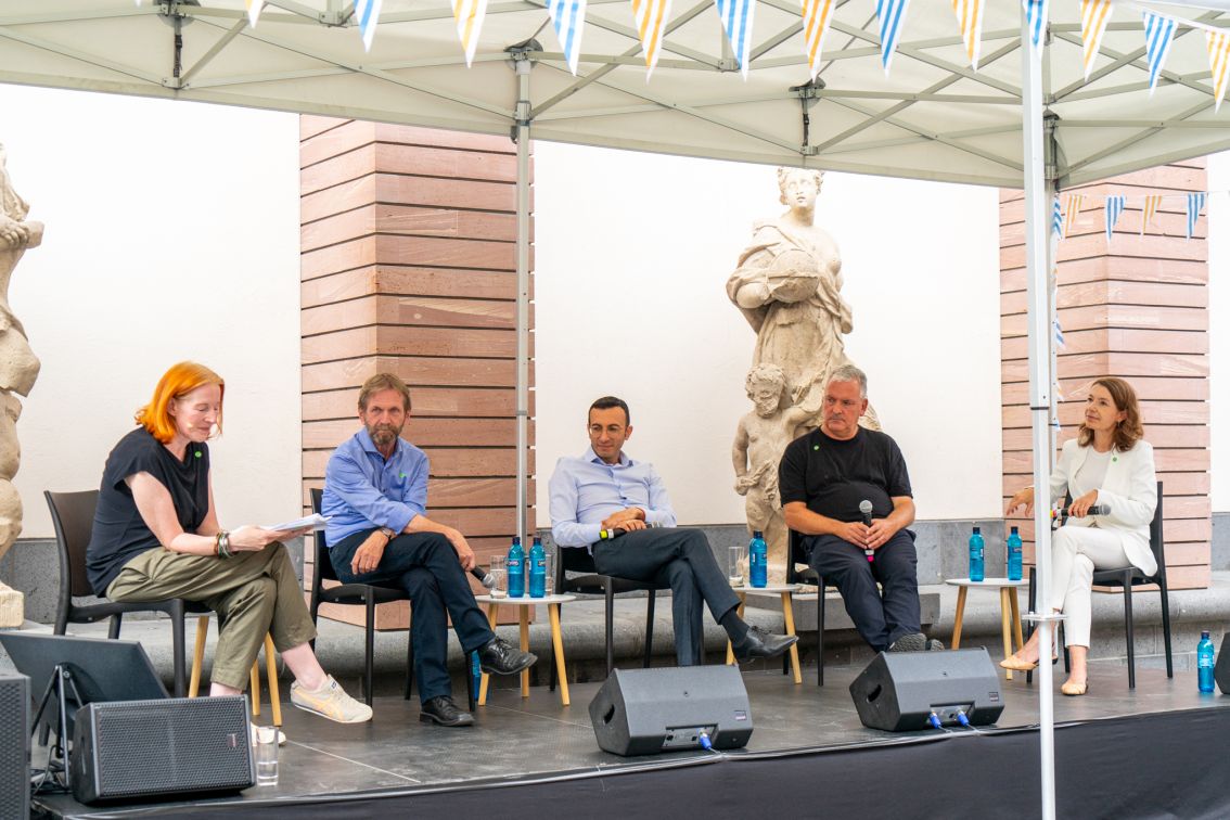 Es ging um Zukunftsfragen, neue Wege der Kommunikation sowie neue Dimensionen von Zeit und Raum für Frankfurt und die Region. Mit zahlreichen Impulsen und einem von Andrea Jürges (stellvertretende Direktorin, Deutsches Architekturmuseum, DAM) moderierten Talk zwischen Prof. Dr.-Ing. Holger Schmidt (TU Kaiserslautern; Projektleitung „Jugend denkt Stadt“ in Zwingenberg), Mike Josef (Planungsdezernent der Stadt Frankfurt am Main), Martin Bieberle (Leiter Fachbereich Planen, Bauen und Umwelt der Stadt Hanau) und Monika Böttcher (Bürgermeisterin Maintal) wurde der Blick deutlich über die eigenen Stadttore und einzelne – eigene – Planungen hinaus geweitet, der interkommunale Dialog im Großen Frankfurter Bogen gestärkt und die Bürgerinnen und Bürger aktiv eingebunden. Ziel war es, neue Zukunftsbilder zu generieren, die Lust darauf machen, Zukunft aktiv zu gestalten. Flankiert wurde der Zukunftsdiskurs von Angeboten für Kinder und Jugendliche (auf Grundlage des Spiels Minecraft/DAM) und einem abendlichem Open-Air-Kino.